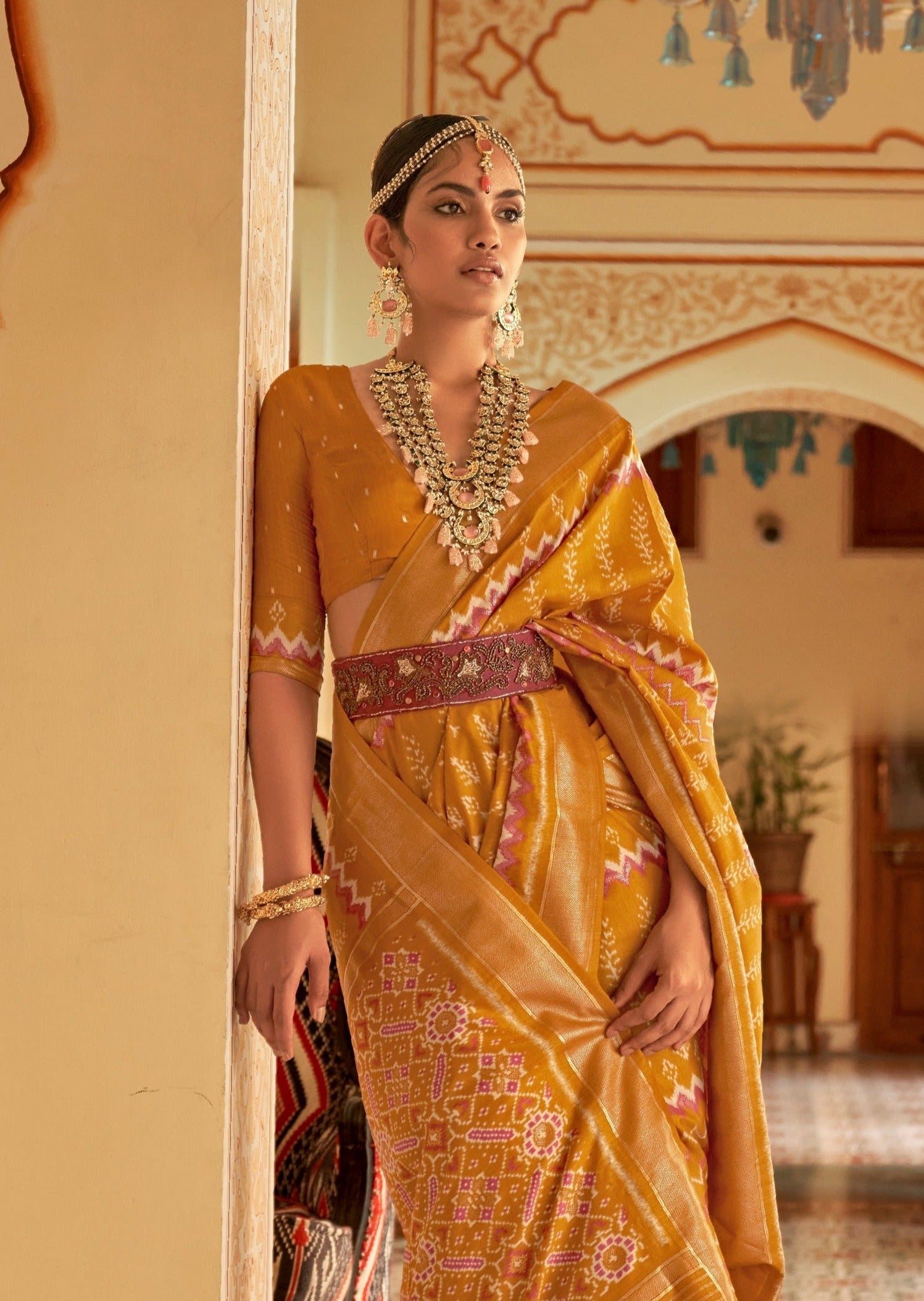 Originating from Patan, Gujarat, this saree is renowned for its geometric patterns, vibrant colours, and rich texture, often symbolising prosperity and luxury.